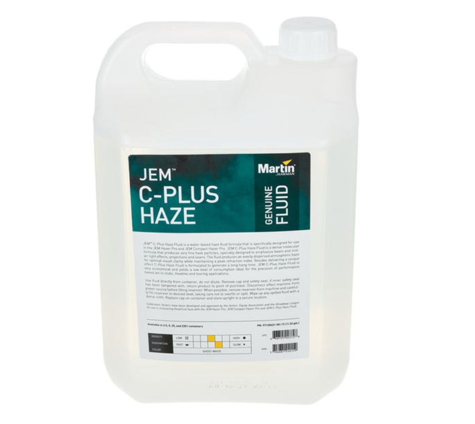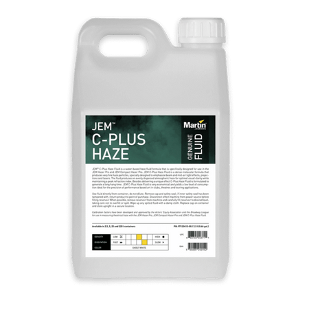 JEM™ C-Plus Haze Fluid is a water-based haze fluid formula that is specifically designed for use in the JEM Hazer Pro and JEM Compact Hazer Pro. JEM C-Plus Haze Fluid is a dense molecular formula that produces very fine haze particles, specially designed to emphasize beam and mid-air light effects, projections and lasers. The fluid produces an evenly dispersed atmospheric haze for optimal visual clarity while maintaining a peak refraction index. Besides delivering a unique effect C-Plus Haze Fluid is formulated to generate a long hang time. JEM C-Plus Haze Fluid is very economical and yields a low level of consumption ideal for the precision of performance based art in clubs, theatres and touring applications.