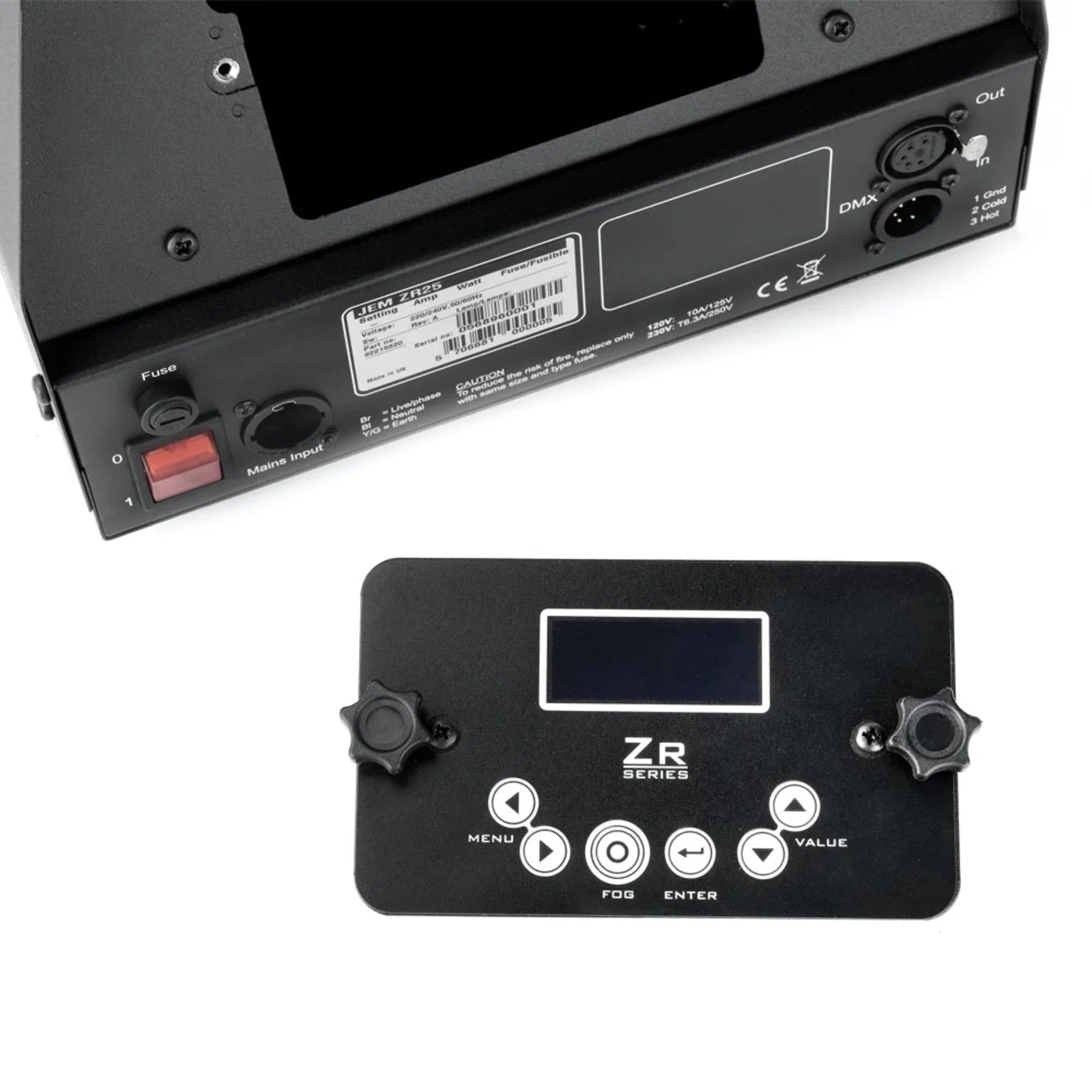 The JEM ZR25 is a small, yet powerful fog machine designed to deliver superior and uninterrupted performance in demanding professional applications. Via its 1,150 W heat exchanger, the JEM ZR25 produces large amounts of fog ideal for small to medium-sized venues and stages in both install and rental markets.The JEM ZR25 features variable output control for more subtle effects and is fully up-to-date with an integrated digital remote control, and DMX with RDM. The entire JEM ZR range is compatible with a wide range of JEM Pro fog fluids. As machines designed and built to last, the JEM ZRs will continue to perform with great output and low consumption.